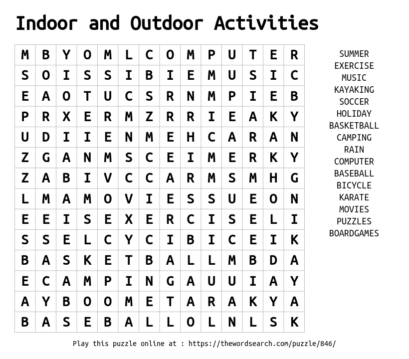 Indoor and Outdoor Activities Printable Word Search