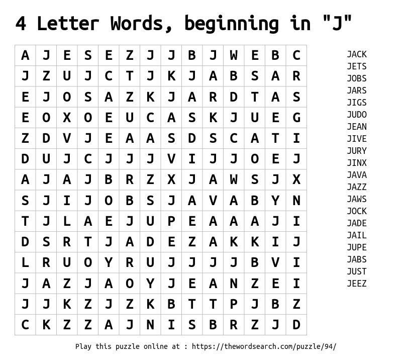 4 Letter Words, beginning in "J" Printable Word Search