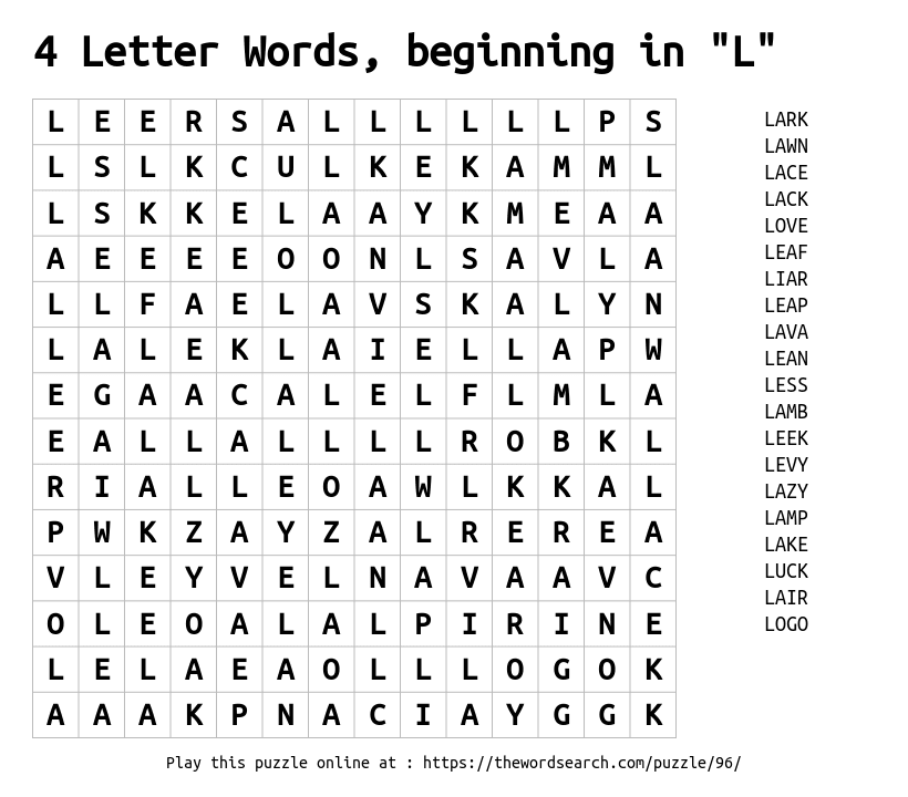 Print this 4 Letter Words, beginning in "L" word search and enjoy a relaxing puzzle with 24 words.
